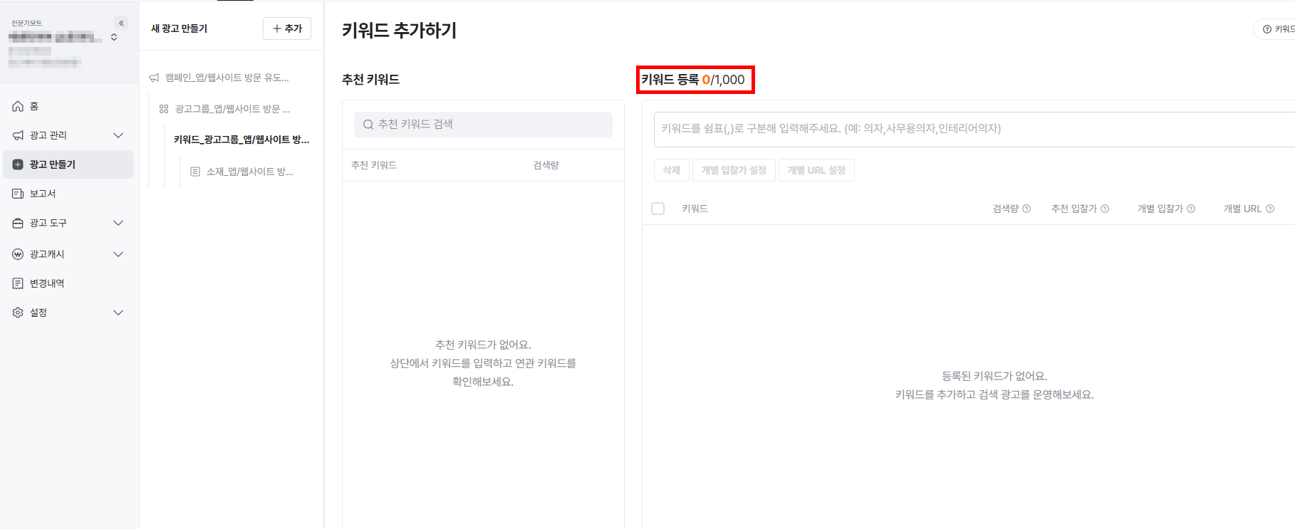 -> 그룹당 최대 1,000개 키워드, 광고 계정에는 최대 10만개, 각 키워드별 개별 입찰가와 개별 URL 설정이 가능합니다.
