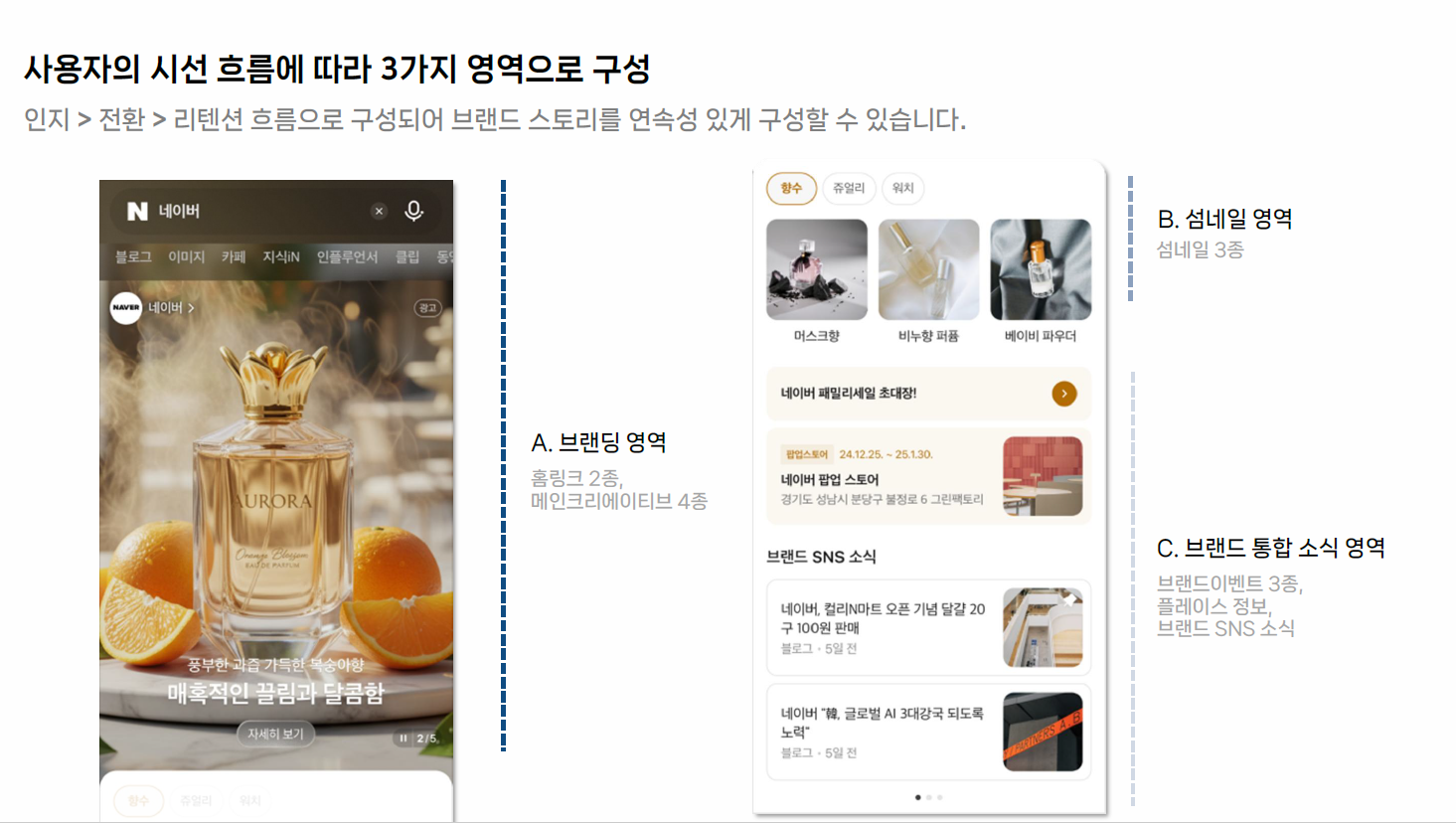 검색창부터 차별화된 UI 적용이 가능합니다. 쇼핑라이브, 숏클립, 브랜드 SNS 소식 기능과 네이버 플레이스 정보까지 연동 가능합니다.