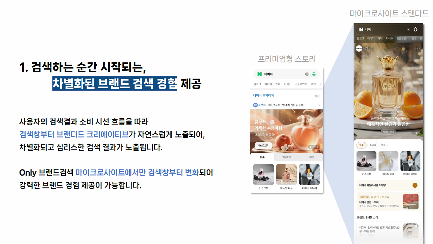 네이버 브랜드검색 마이크로사이트 스탠다드 베타는 브랜드 검색 경험 강화, 다양한 소재 활용을 통한 광고 효과 증대가 가능한 상품입니다. 또한, 모바일 브랜드검색에 최적화되어 있는 상품으로, 사용자 경험을 강화합니다.