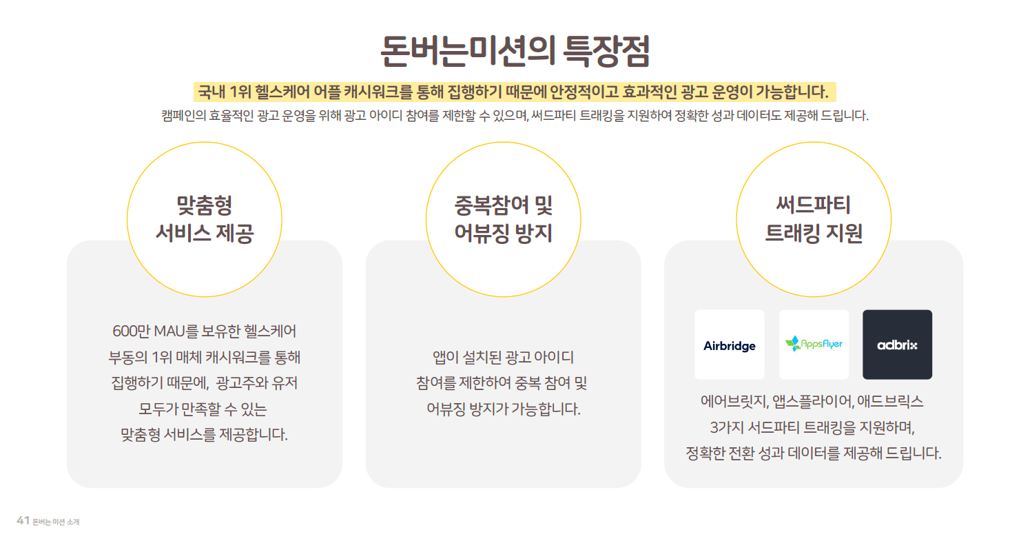 사용자는 미션 참여를 통해 캐시를 적립하고, 광고주는 설치·실행·참여 등의 목적에 맞는 캠페인 운영이 가능합니다. 또한, 참여 조건과 보상 구조가 명확하게 안내되어 사용자의 이탈을 최소화하는 구조입니다.