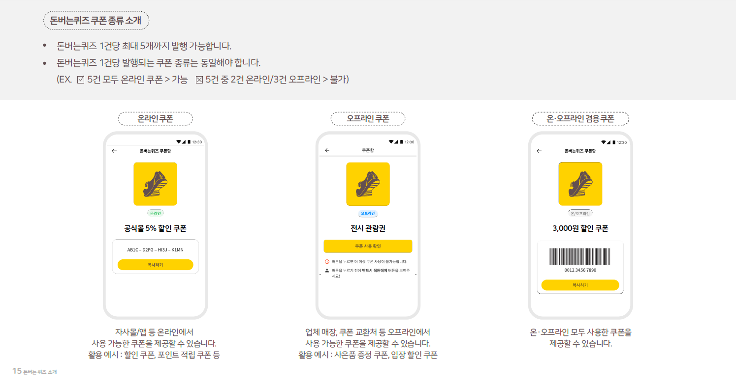 사용자가 정답을 맞히면 쿠폰이 자동으로 쿠폰함에 등록되며 온라인 쿠폰뿐 아니라 오프라인 쿠폰도 제공이 가능합니다.