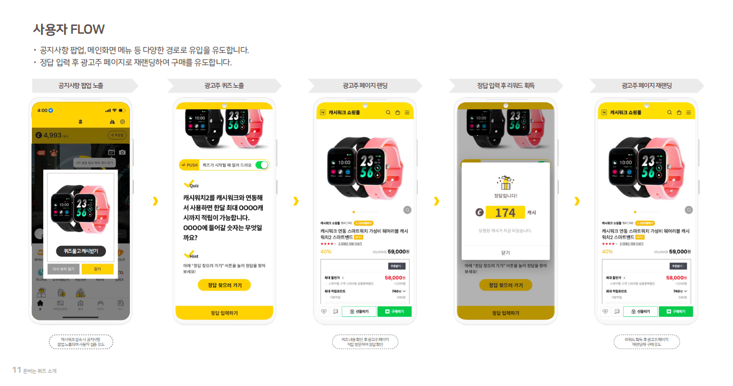 사용자는 특정 시간에 공개되는 퀴즈에 참여해 정답을 입력하면 캐시 또는 쿠폰 형태의 리워드를 받을 수 있습니다.
