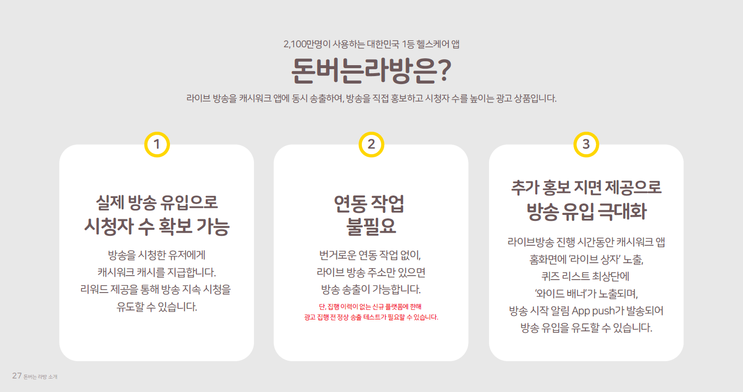 라이브 방송 시청 유저에게 캐시워크 캐시를 지급하는 구조로, 리워드를 통해 방송 시청 지속을 유도할 수 있습니다.