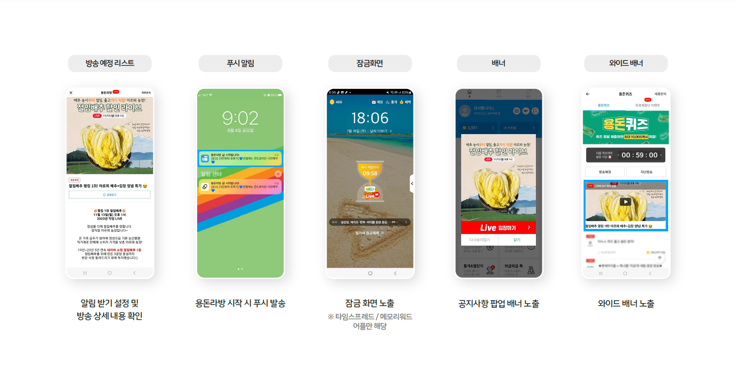 총 6개 지면에 동시 노출되며, 라이브커머스 시청자 유입 극대화에 특화된 구조입니다.