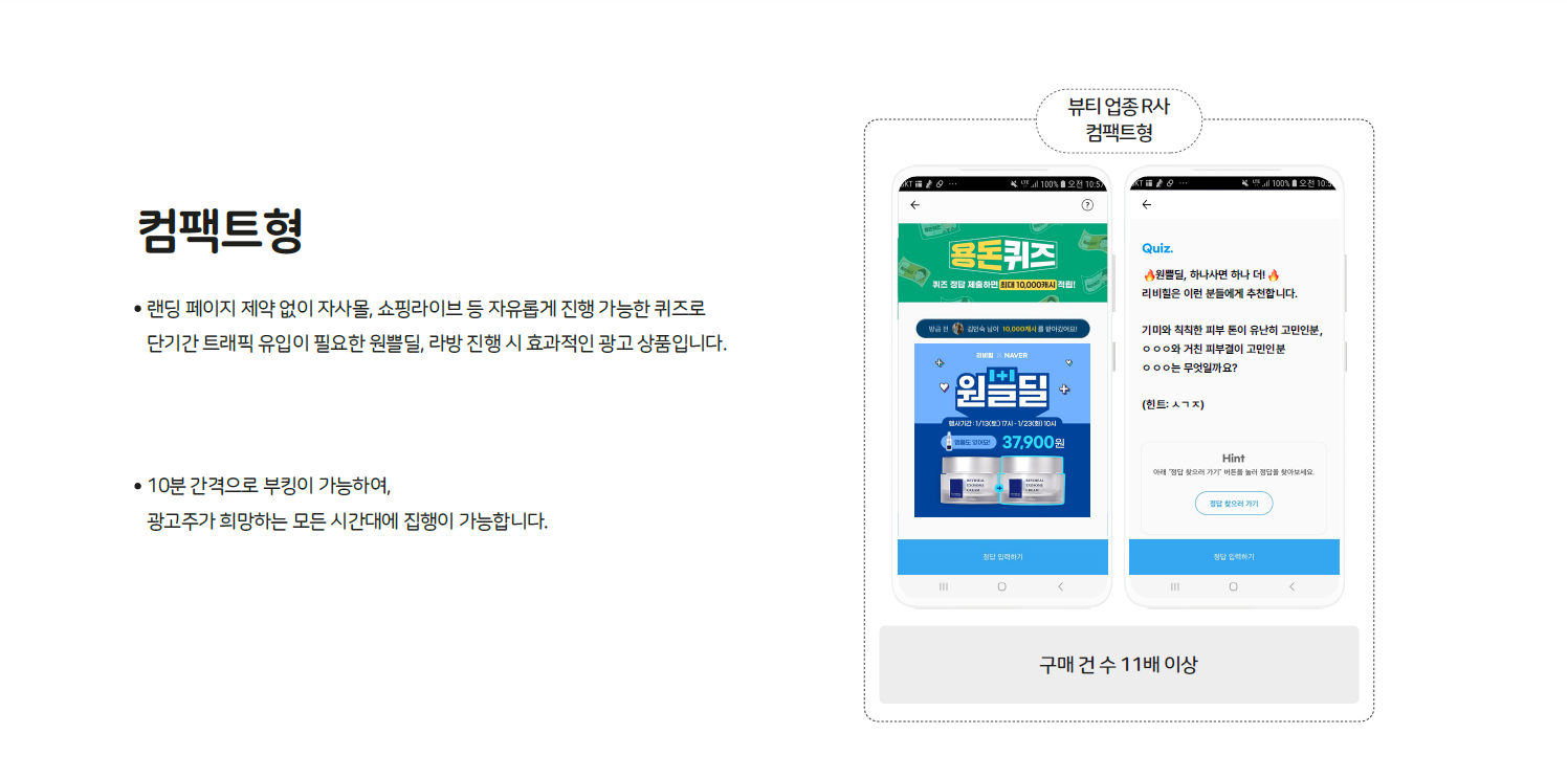 랜딩 페이지 제약 없이 자사몰, 스마트스토어, 쇼핑라이브 등 자유롭게 연결 가능한 퀴즈형 광고입니다.