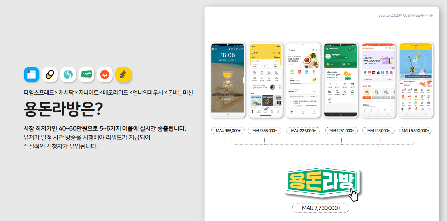 대형 리워드 앱에 동시에 노출되는 용돈퀴즈x용돈라방 앱 광고 상품을 안내드리겠습니다.