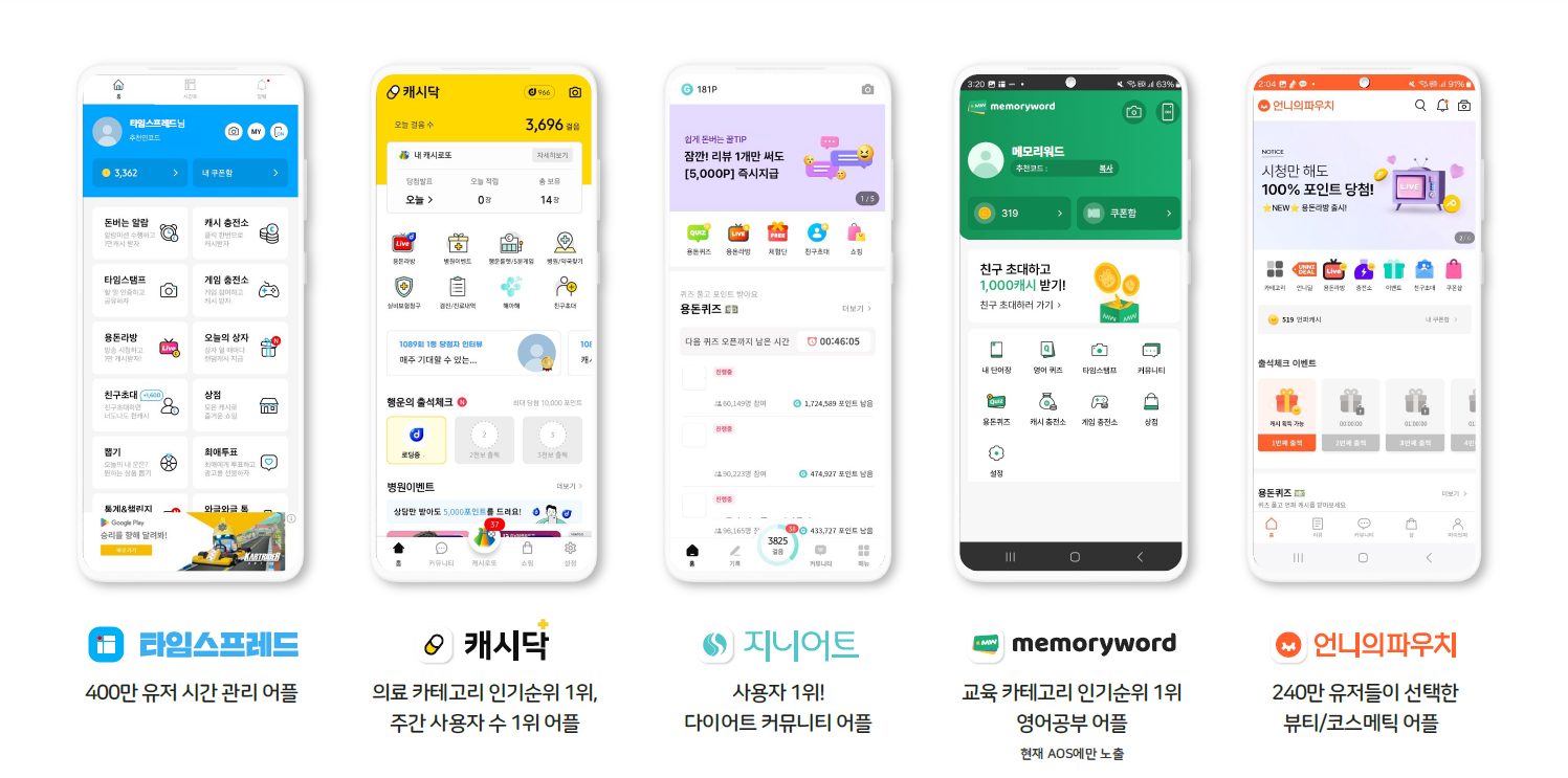 캐시워크(돈버는라방), 타임스프레드, 캐시닥, 지니어트, 메모리워드, 언니의파우치