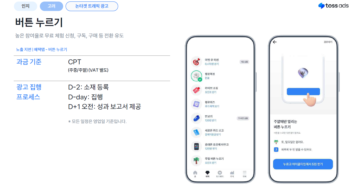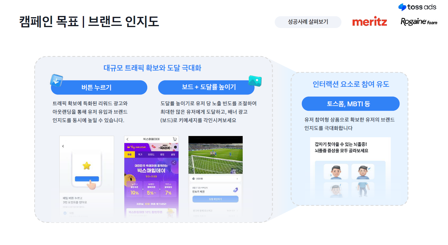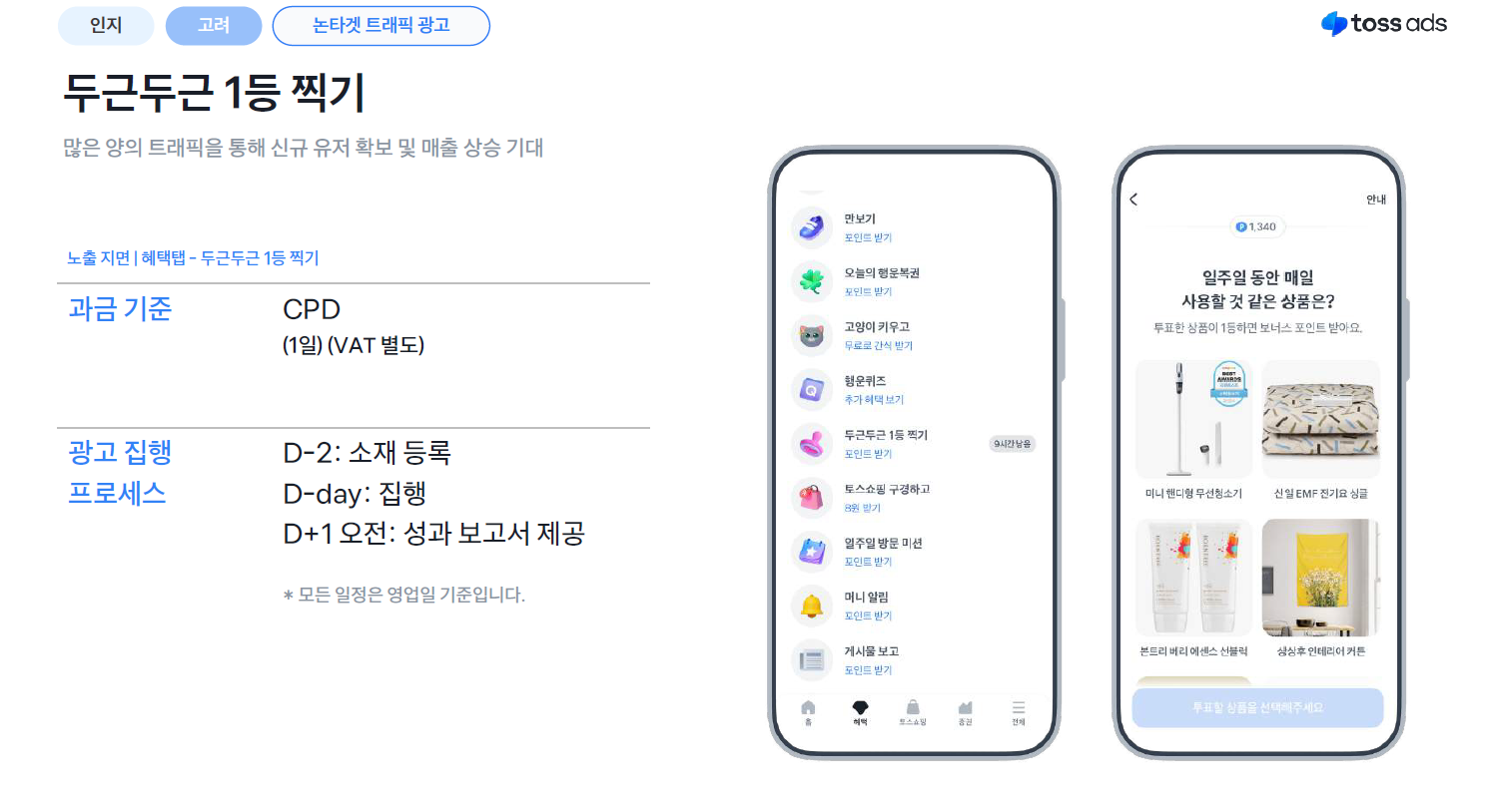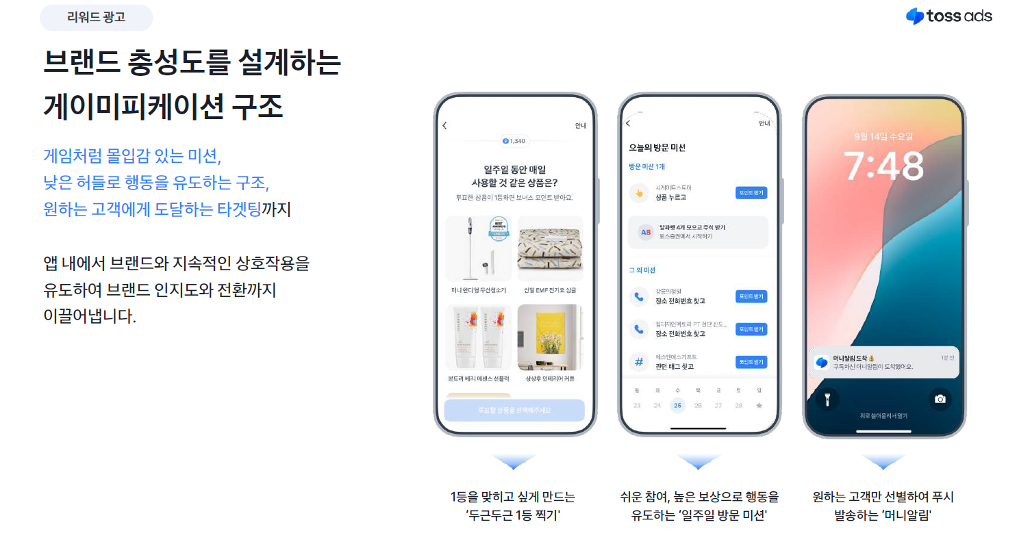즉, 노출 > 참여 > 행동 > 전환 > 반복 흐름이 토스 광고 안에서 자동으로 만들어집니다.