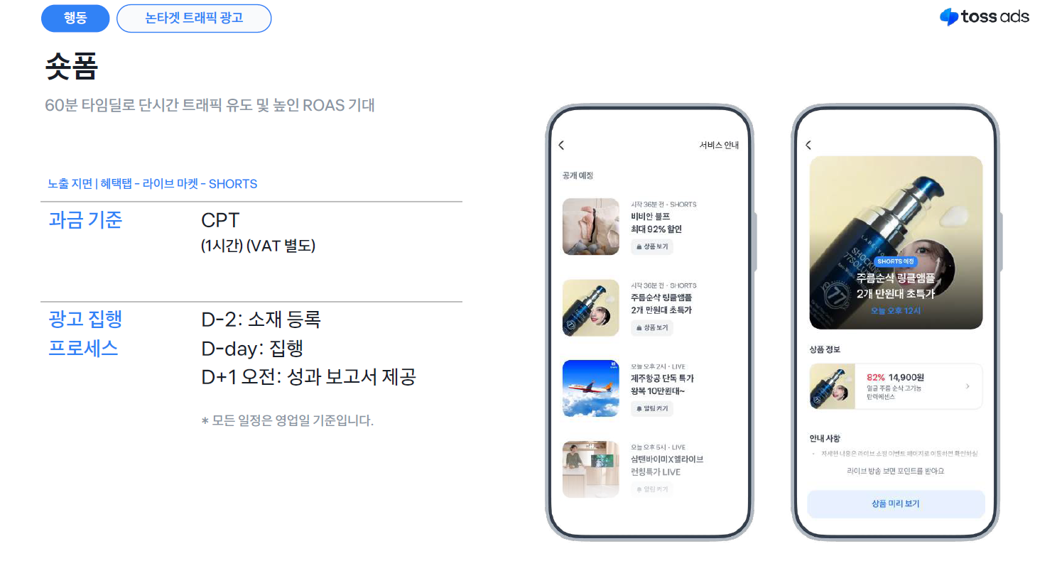 짧은 시간에 키 메시지 노출하여 브랜드 인지동와 대량 노출에 특화된 상품입니다.